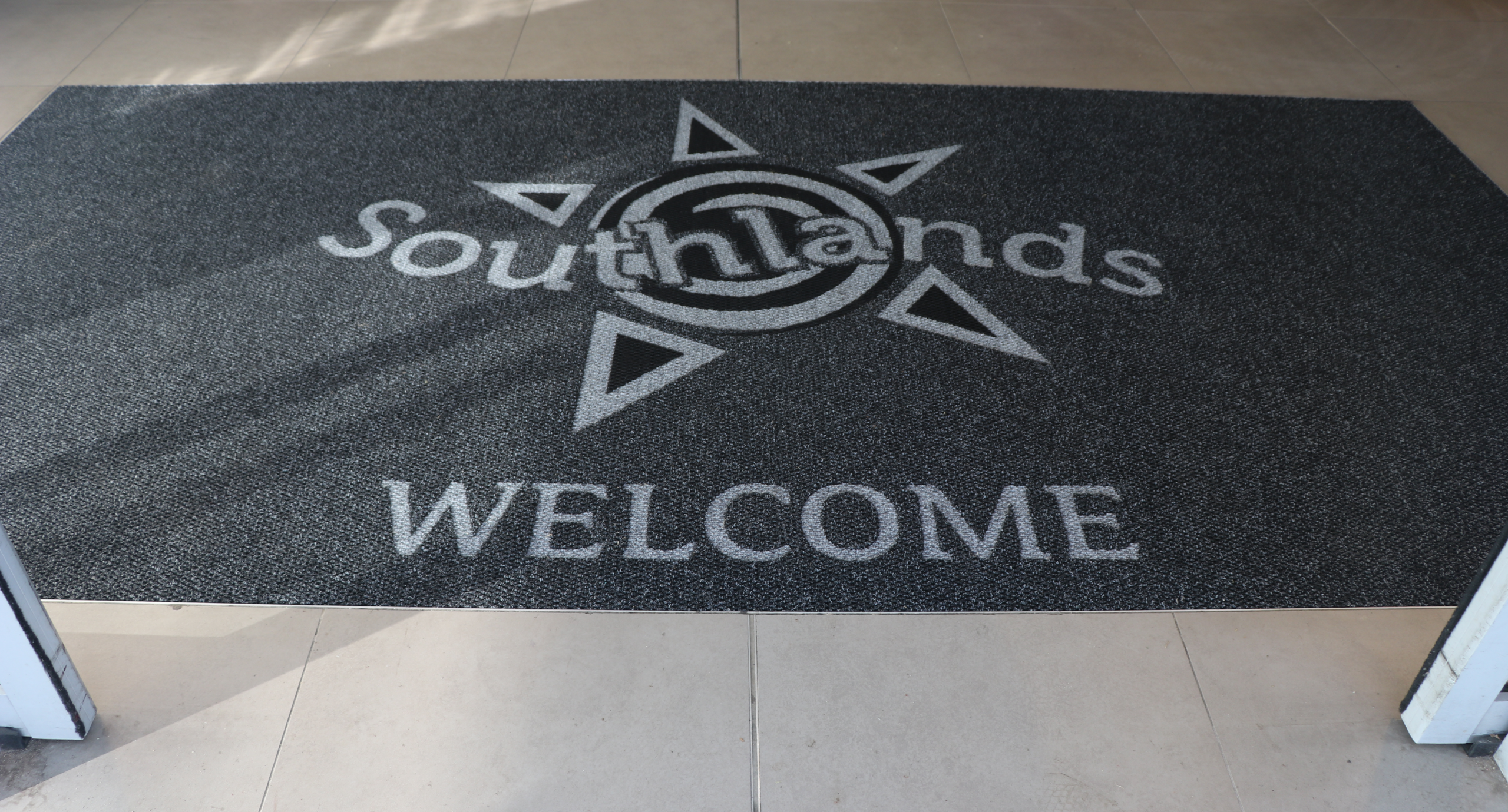 the Southlands Shopping Centre logo - a sun symbol - is printed onto a tough scrape design logo entrance mat. The mat is fitted into a recess surrounded by white tiles.