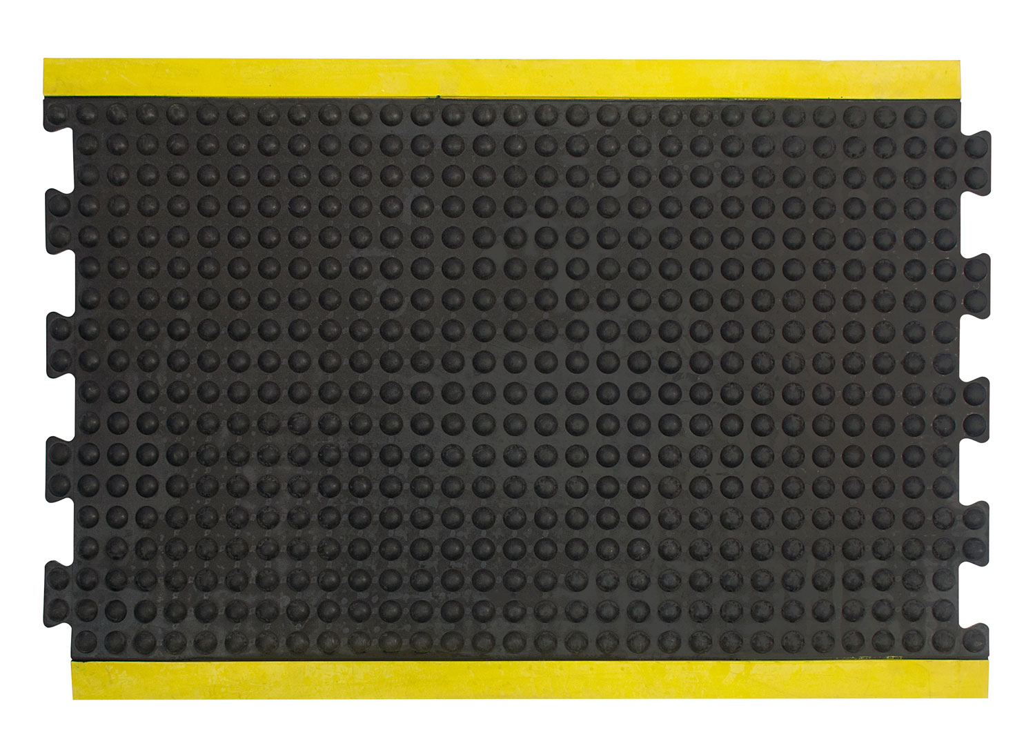 A single middle tile from the modular anti fatigue bubble mat is shown alone. It has a black surface with bubbles and a yellow safety border.